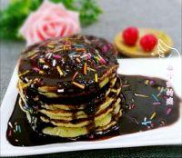 10.拌匀的巧克力炼乳淋在松饼塔上,洒糖针装饰即可