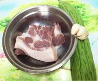 3.猪肉末用蒜末、盐、生抽、生粉、料酒腌制20分钟备用,苦瓜用盐搓洗干净切段,去内瓤。