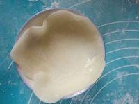 4.面团我分成了五份,一份差不多35g左右,忘记拍照了。拍点熟糯米粉防粘,擀成薄厚均匀的面皮,圆形方形不规则型都可以,只要自己好包就行,擀好的面皮放在小碟子里,我家的小碟子就是小小的那个放蘸料的碟子。
