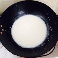 5.用一个勺子把煮开的牛奶慢慢倒入蛋黄中,一定要慢慢的,以防蛋黄烫熟。
