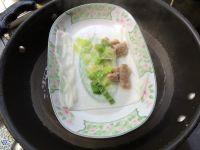 13.牛肉粉肠制作:将蒸碟先刷一层熟花生油膜,再平铺上粉皮后,撒入3~4片牛肉片、适量的生菜丝,然后放入蒸锅蒸制3分钟取出。