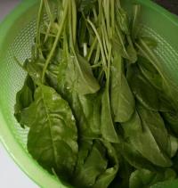 2.将观达菜去掉根和黄叶,洗净沥干水份待用,大蒜去皮切碎