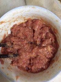 1.肉末加入鸡蛋、生粉、盐、酱油、油、黑胡椒粉拌匀,刚开始会比较稀,只要顺一个方向搅拌肉末,肉末就会变得起胶、粘糊。(绿色是芥末,煮熟后没特别味道,故可不加)