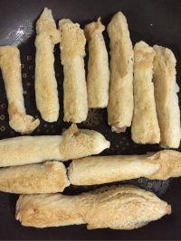 5.竹荪底部剪个口,将肉末从裱花袋挤入竹荪,放入加油的大粘锅煎