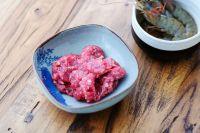 3.猪里脊肉剁成肉糜调入1/2茶匙精盐,抓匀腌渍10分钟。