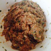 3.肉泥里加入所有调料,生抽,味极鲜酱油,葱姜,盐,五香粉,适量清水,鸡精。顺着一个方向搅拌上劲,到水分完全吸收。