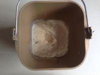 3.面包桶内依次放入牛奶、蛋液,对角放糖和盐,再放奶粉、面粉,在面粉顶端放入酵母。启动面包机的和面程序15分钟。