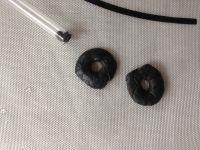 13.黑色面团弄成两个小小的圆形,中间部分用吸管压出小孔。