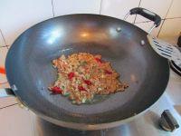 4.中火坐锅:锅热后倒适量油,油六成热后将肉末入锅炒散后放入蒜末,干辣椒继续翻炒数下。
