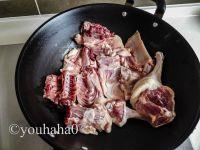 2.鸭子洗净斩大块,炒锅烧热将鸭子皮朝下放入锅中