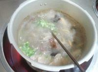 7.将香菇,平菇,山药放入高压锅里,,加盐适量用汤勺搅拌几下,盖盖15分钟,放气。