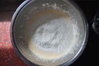 6.将烧开的牛奶分次倒入到蛋糕糊中,边倒入边搅拌,然后放置一旁冷却。