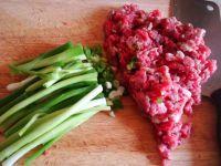 1.羊肉泡一晚,洗净,与小葱一起剁馅;