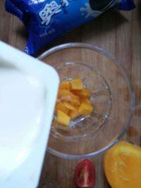 6.再倒酸奶至九分满,加奧利奥碎,芒果粒和圣女果