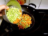 6.将焯过水的青豆和胡萝卜粒倒入锅中,炒至断生。