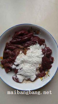 2.猪肝切片,倒少许白酒,、酱油、醋,放一点白糖,胡椒,放一大勺淀粉,搅拌,腌制20分钟以上