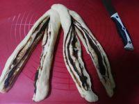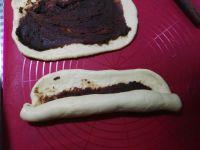 12.取一份面团擀开,在上面均匀的涂抹豆沙。