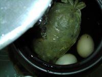3.将药袋同浸泡水一起放入砂煲,加入鸡蛋。