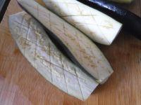 3. 然后,把茄子洗净顺长切开,在里侧划刀