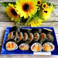 5.把米饭加入寿司醋和盐抓匀、把竹帘放在最下层、再放海苔、铺上米饭、放上肉松和所有条.