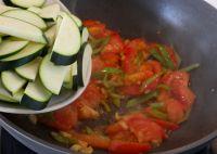 8.将西葫芦对半切,再斜切片;西红柿切船形;青椒去籽,斜切条,大蒜拍一下切粗粒。