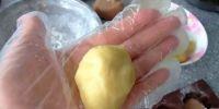10.将炒好的豆馅按模具所需的量称量分好。取一份无色豆馅揉成光滑的圆球。