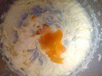 3.把糖粉分两次加入,先加一半用打蛋器低速混合均匀就可以了,再倒另一半进去。只要看不见糖就可以了