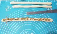 2.长面条卷花卷时,尾端用手稍捏扁并沾点清水压实,这样花卷尾端才不会松散开。