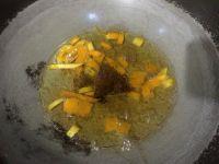12.将步骤11的陈皮、橙皮粒连带泡水一起倒入锅中,再加入50克花生油,用中小火将泡水煮干。