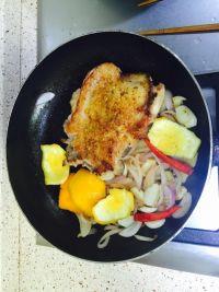 7.另一面煎制金黄后。翻面将番茄贴边放入煎制 用筷子轻轻叉入鸡肉。叉的进 说明熟(鸡肉上有白色凝结物物也说明熟了)放入西兰花煎制一下(忘拍了)