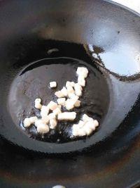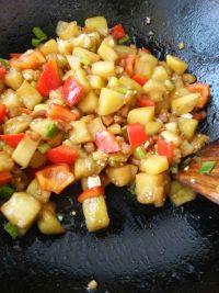 7.加入姜沫,一半葱花蒜沫,加入柿子椒丁翻炒均匀