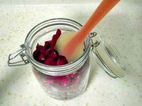 6.准备一个较大的玻璃瓶,我的玻璃瓶容量是1升的,此份量刚好满瓶,将擦干的玫瑰花瓣放入瓶内,用硅胶刀压紧实点;