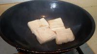 4.锅中倒入适量的油,待油温稍热时,放入豆腐文火煎。