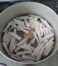 7.炖至萝卜条变色变软后,放入豌豆、鹌鹑蛋和金针菇加盖大火