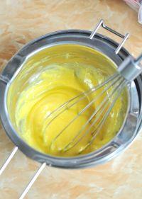 1.蛋黄加糖搅打均匀,隔热水一直搅拌到浓稠。