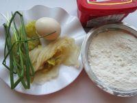 4.把面粉里加鸡蛋、水、加泡菜末、香葱末拌均匀